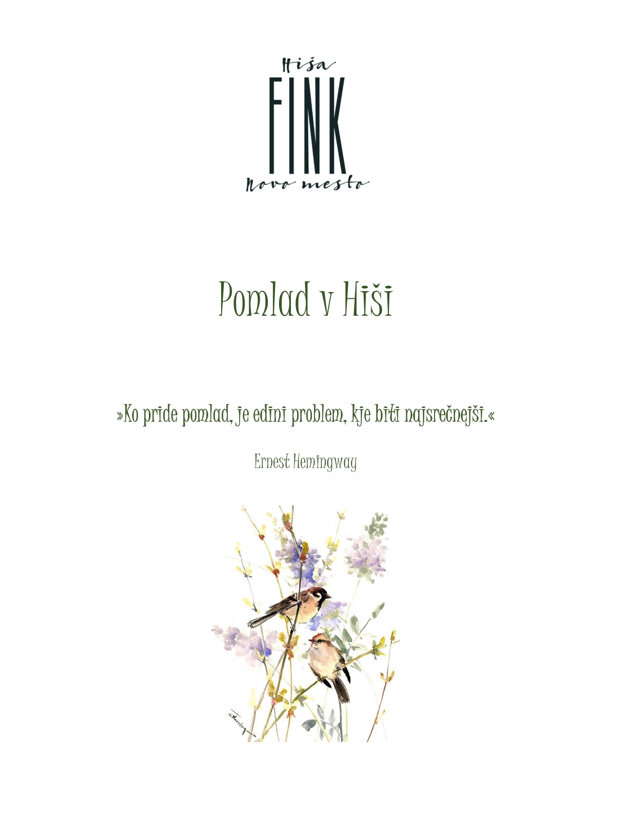 Gostilna Hiša Fink združuje le najboljše, kar ponuja narava. Navdiha za jedilnike nam tako ne zmanjka. Nežne dišave in vznemirljive barve iz naše okolice prebudijo naše čute ter se združijo v okusnih jedeh na vaših krožnikih. Letni časi in sezonske sestavine nas vsako jutro presenetijo z nečim novim, ki se kaj kmalu znajde na vašem krožniku. Dramaturgija okusov v naših jedilnikih vas bo popeljala po taščinem vrtu, bližnjem gozdu in sosedovem travniku.